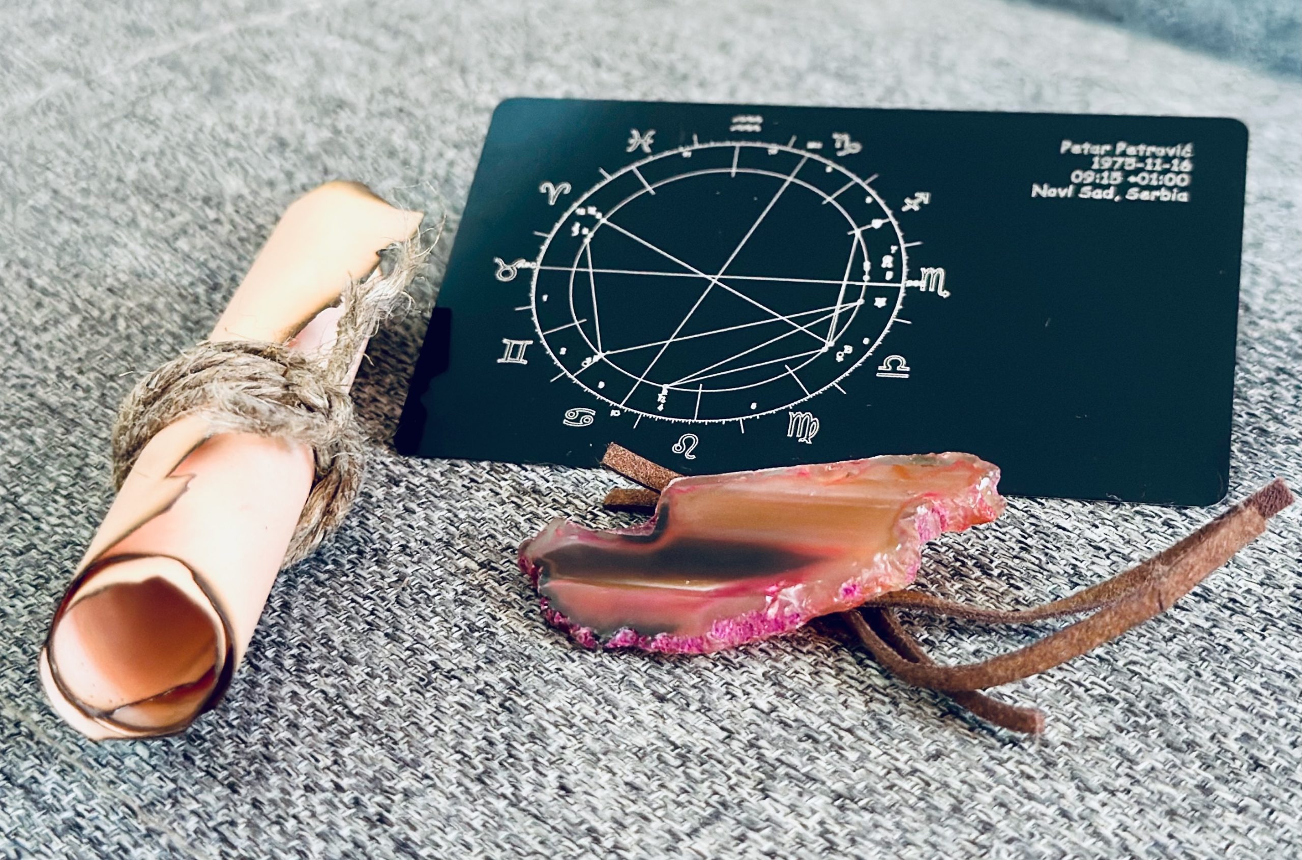 Your birth chart precisely engraved onto a dark aluminum plate, a sleek and enduring representation of your cosmic blueprint. A hand-selected natural stone, chosen to harmonize with your zodiac sign, set on a genuine leather cord. Wear it close to your heart as a symbol of balance and alignment. A delicately engraved parchment sheet featuring an additional table of astrological aspects, completing your chart with depth and detail. This bundle is more than jewelry or keepsake—it is a bridge between craftsmanship and cosmos, designed to let you carry your stars wherever you go.