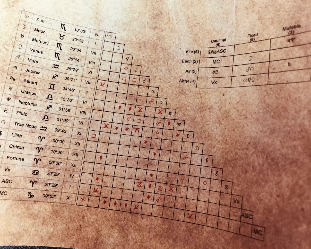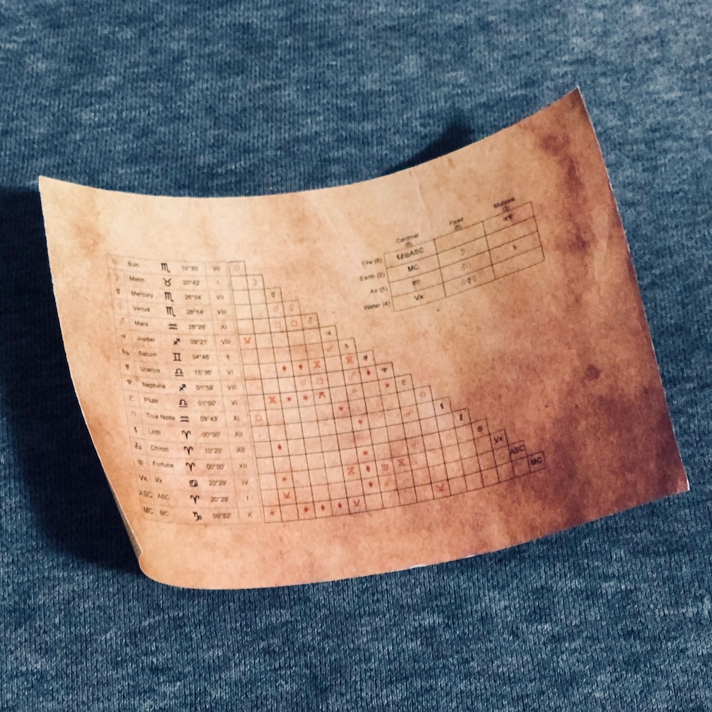 The Celestial Parchment is a delicate yet powerful extension of your natal chart. A timeless piece that deepens your connection to the stars. Printed on aged paper, it reveals an additional table of astrological aspects that go beyond the chart itself, offering insight into the cosmic forces that shape your personality, relationships, and destiny.